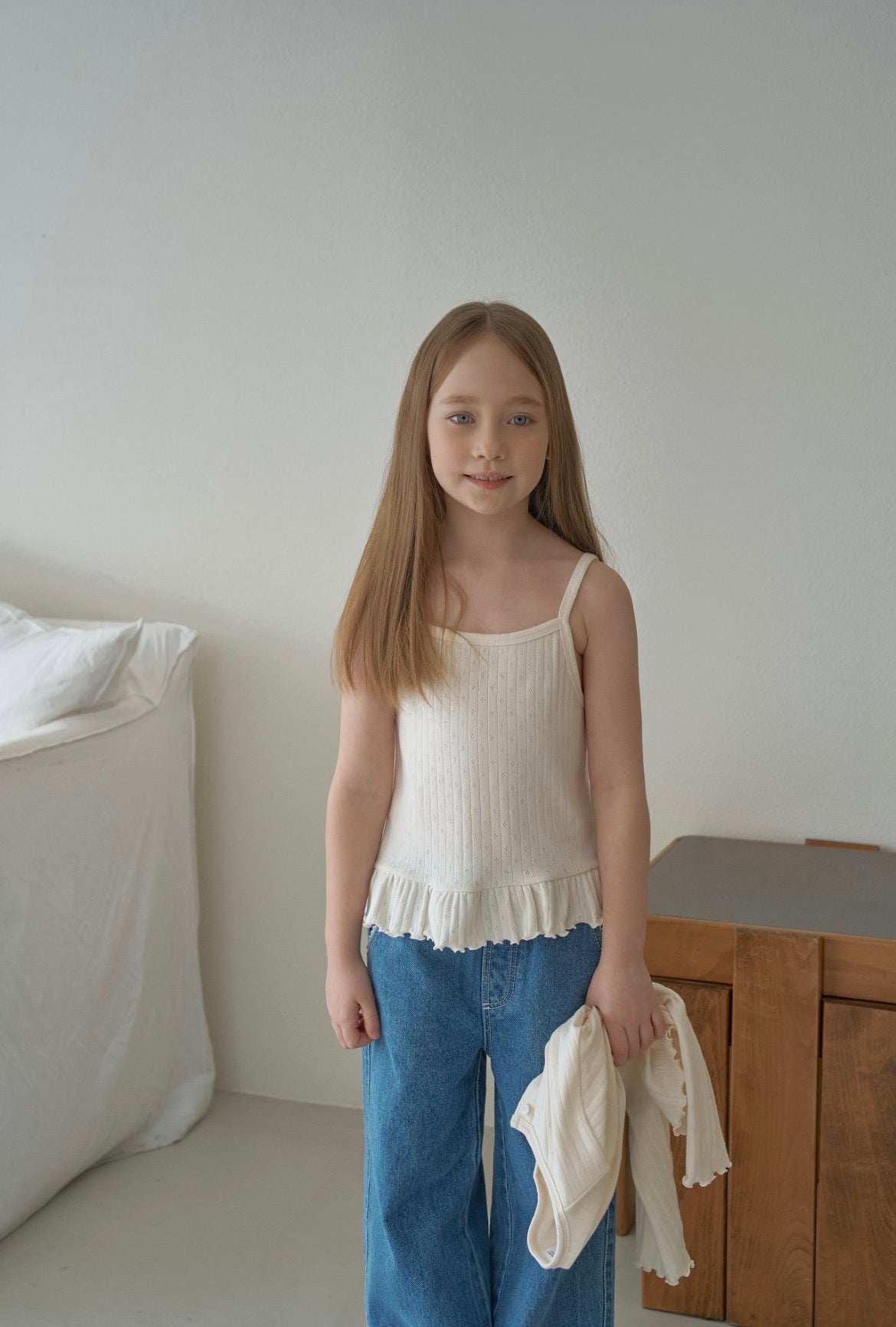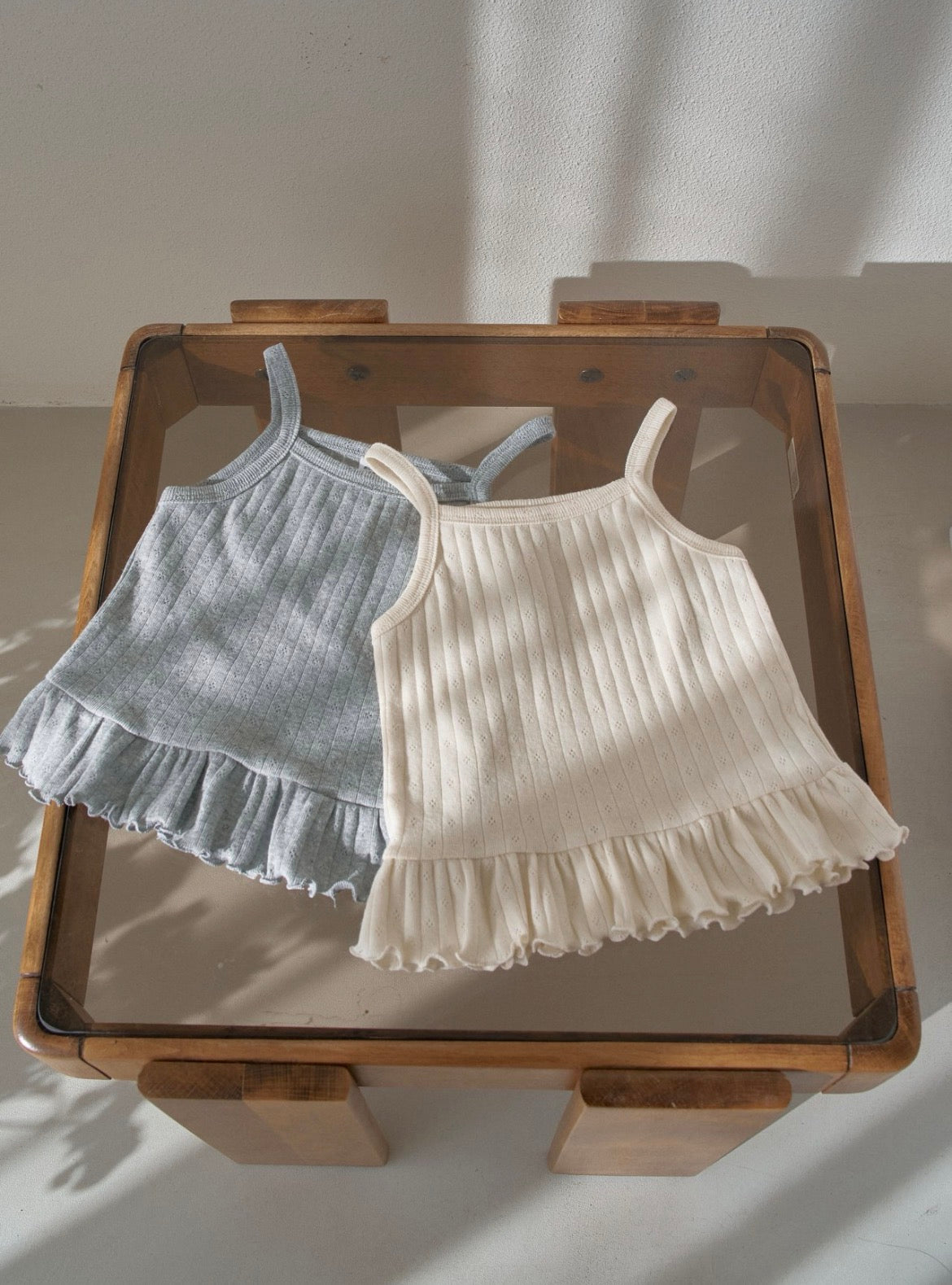 綿、スパンにアイレット素材にフリル紐の袖なしとカーディガンセットです、